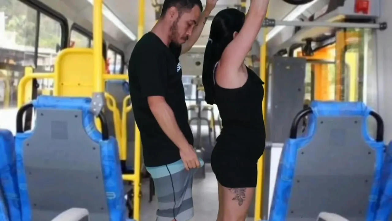 On a busy public bus, a young man with white skin and small height takes aggressive with his large cock rubbing against a beautiful brunette's round, firm ass. The dirty scene ends when he cums all over her dress. This explicit and risky encounter captures a real orgasm and showcases her bareback white skin, a true gostosa from Brazil.