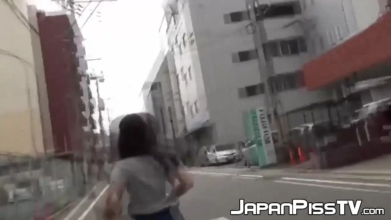 A shy, dark-haired Japanese babe with a hairy pussy needs to pee badly. She brings a friend along to record her as she pees in her knee-highs and lingerie in public. The voyeuristic atmosphere heightens the fetish as she pisses on camera for her audience.