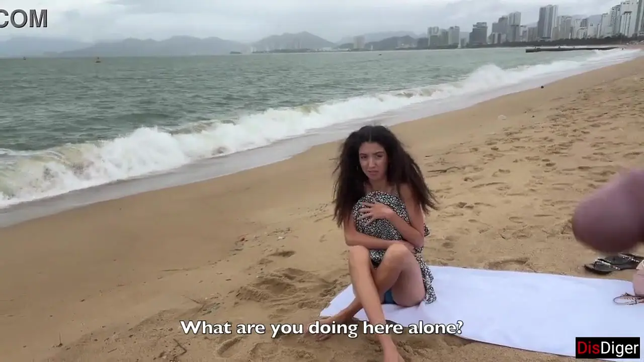 A slutty, skinny brunette in beachwear asks if she can cum on her natural, tiny tits. She teases him with a handjob on the public beach, and he cums all over her uncovered breasts.