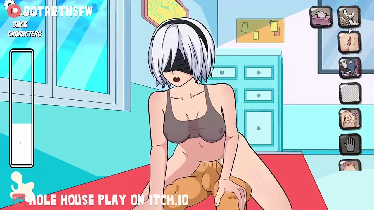 In this slutty and explicit scene from Hole House Game, Yorha 2B is seen pleasuring herself with a large dildo. She then takes a giant cock deep into her hole and squirts all over it. Finally, she gets a giant creampie from the lucky guy, filling her up completely.