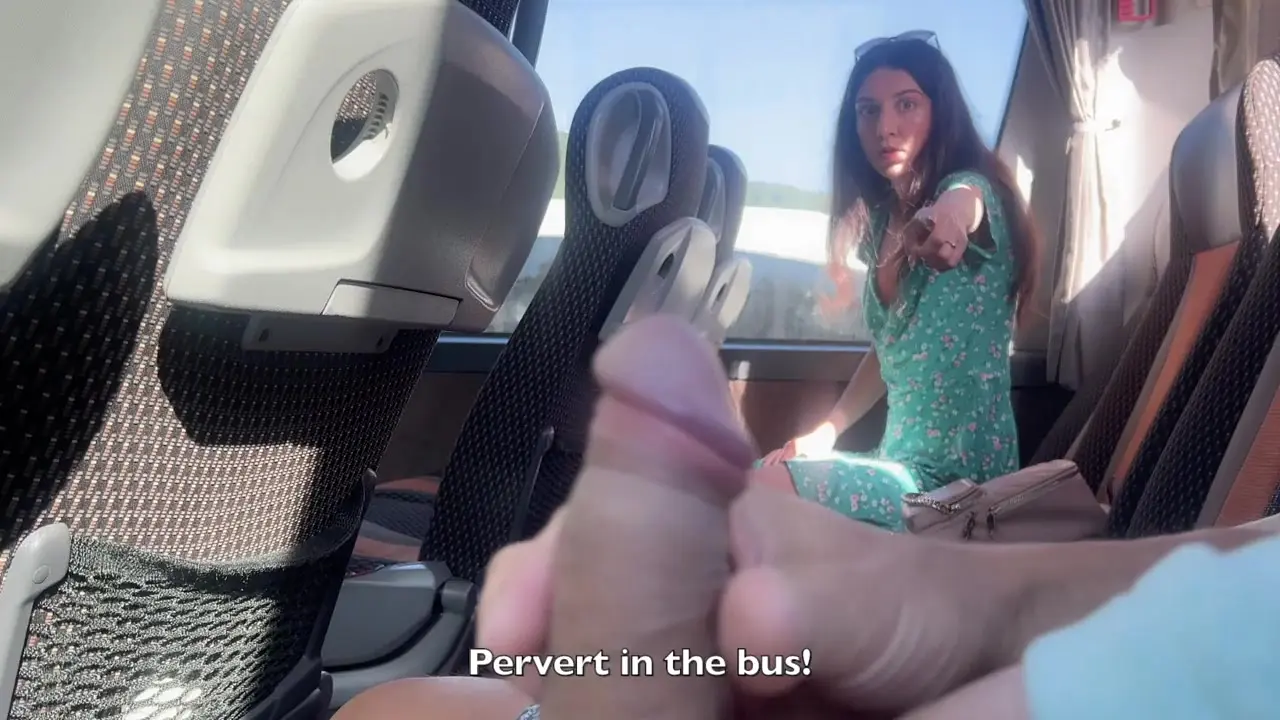 A perverted guy flashes his hard dick to a surprised girl on the bus. She watches as he jerks off and grabs his dick, leading to a hot handjob scene. The POV close-up shows his excitement and her reactions.