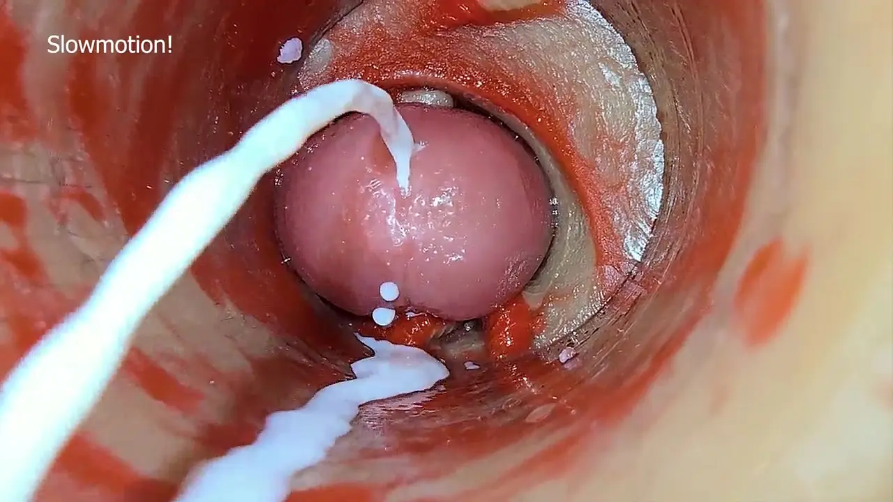 Close-up of a wet, pink pussy with large labia getting filled with a big dildo. She moans as the camera captures her tight pussy and the juicy creampie she swallows. The endosc view makes the experience more intimate for her and the viewer.