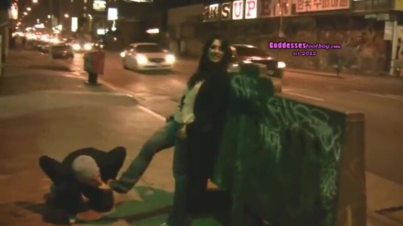 In this kinky public scene, a boy becomes the willing slave to his hot goddess crush. He sucks and licks her sexy feet, making sure every inch is clean. She smiles as he worships her beautiful toes. In the end, she steps on his face and leaves him gasping for air.